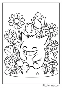 Gengar among blooming flowers and baby chicks