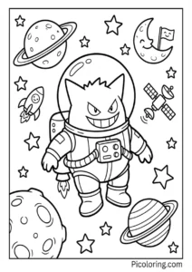 Gengar in an astronaut suit among stars and planets