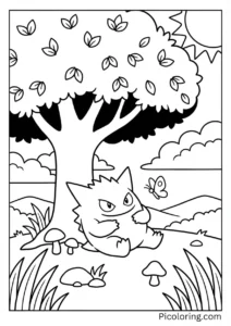 Gengar resting under a large shady tree on a sunny day